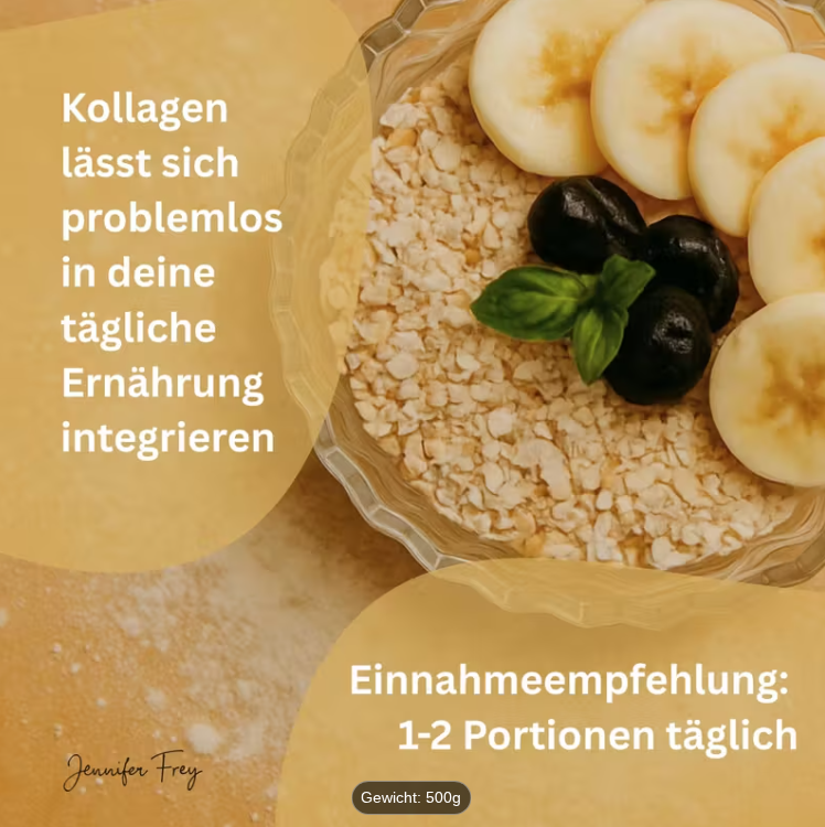 Jennifer Frey Kollagen Hydrolisat Peptide Pulver ist ein leicht lösliches Kollagen-Protein, das du jeden Tag bequem in Getränke und Speisen integrieren kannst – für eine eiweißbewusste Ernährung.